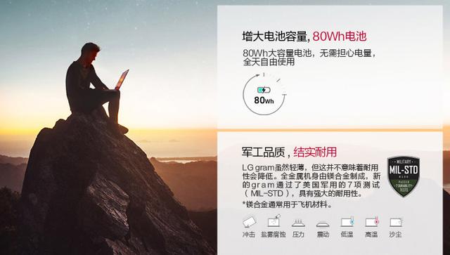 为什么说轻薄对于商务人士非常重要,因为经历过出差的人都知道,携带的行李越轻越简便,差旅体验就越轻松。能用一个背包解决的事情,绝对不会动用行李箱。而过于沉重且体积较大的笔记本电脑则很难装入背包内,更别提要携带其他必备的生活用品了。相比传统的17寸笔记本电脑动辄2.5KG甚至更重,LG gram 17Z90N的重量大大减轻,仅有1350克,比三瓶500毫升饮料还要轻。与此同时,它的体积与15.6英寸笔记本近乎相同,所以可以轻易装进背包内,随你一起走遍天涯海角。得益于镁合金材料的使用,LG gram 17Z90N还具备坚固耐用的特性,并且通过了美国国防部MIL-STD 810G军规测试,在多种恶劣环境下有效保护电脑中的数据不会丢失,一扫用户的后顾之忧。