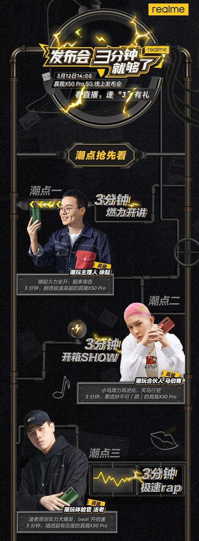 realme真我X50 Pro 5G将于3月12日14点召开国内发布会,和2月24日的全球首场发布会不同,这次的主题是“三分钟发布会”。当然,通过近期官博的解读,网友们也知道并非发布会的总时间为三分钟,但是具体会用怎样新颖的形式?官博上还是“讳莫如深”的吊足了用户的胃口。届时,还会有马伯骞、法老等潮玩大咖空降发布会,也吸引了足够多的关注度。
