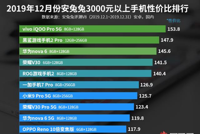 硬件测试机构安兔兔近日公布了2019年12月智能手机市场的性价比机型排行,在3000元以上价位中,iQOO Pro 5G名列第一,紧随其后的则是黑鲨游戏手机2,华为新机nova6名列第三。