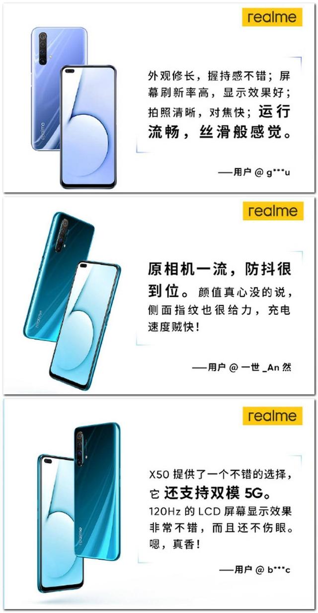 作为荣耀、红米的新对手,realme真我在1月7日发布了开年首款5G手机真我X50,首批用户入手后已经有所反馈,“相机一流,充电超快”、“系统流畅,丝滑般感觉”、“120Hz屏幕显示效果非常不错,不伤眼”等评价反映出了用户对于realme真我X50的高度肯定,也使其成为了5G手机中的一匹黑马。