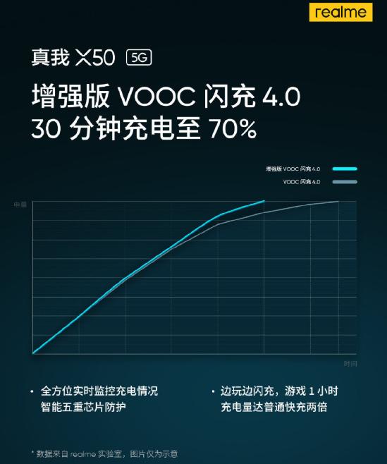 根据官宣爆料,realme真我X50搭载了增强版VOOC闪充4.0,仅用30分钟就能将手机电量充到70%。而且realme真我X50支持边玩边闪充,游戏1小时能够充进两倍于其它快充的电量。