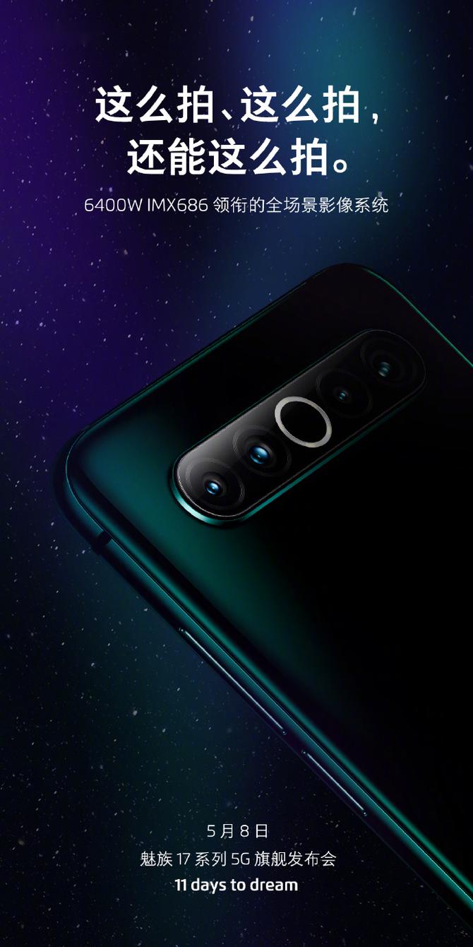 魅族17系列旗舰手机以确认将于5月8日正式发布,根据官方发布的信息,魅族17系列将搭载骁龙865处理器+UFS 3.1闪存+4500mAh容量电池+30W快充+90Hz屏幕。4月27日,魅族官方又“剧透”了一项新配置——搭载6400万像素的IMX686的横置五环影像系统。