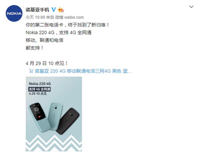 继Nokia 5310复刻版于4月21日正式开售后,诺基亚官方今天又官宣了一款新机——诺基亚220 4G,该机将于4月29日上午10点正式开卖。
