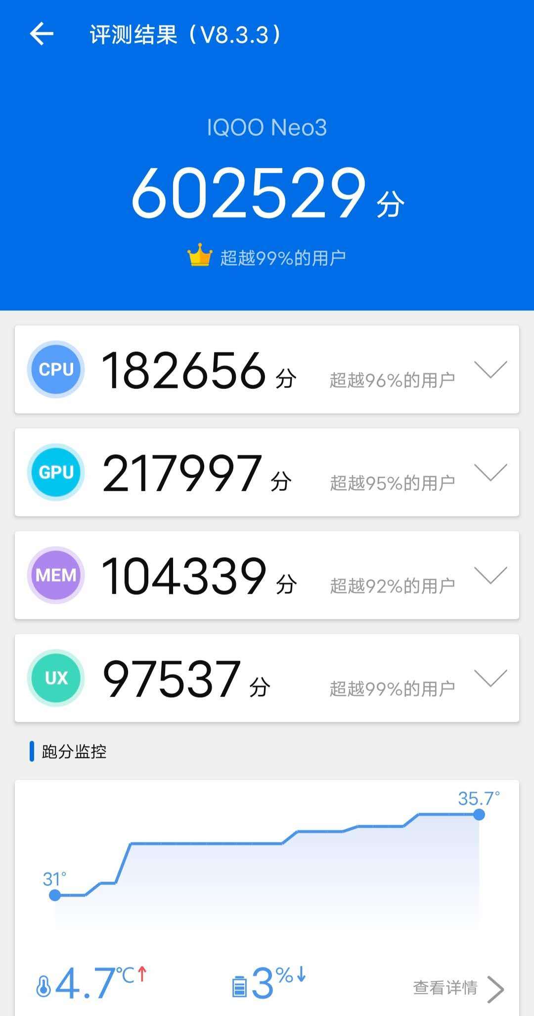 性能是iQOO Neo3最不担心的一件事,因为其不仅搭载了骁龙865处理器,而且还有UFS 3.1超快闪存的加持。相信这两大硬件配置大家并不陌生,骁龙865作为安卓阵营目前最强大的处理器,相较于骁龙855处理器,在性能上有显著的提升,功耗有显著的下降。而UFS 3.1超快闪存带来的更快数据读取/写入速度,可以帮助用户快速完成下载、安装大型应用。当然,在这两大硬件的帮助下,iQOO Neo3轻松拿到了安兔兔跑分测试接近61万的高分成绩,所以在性能方面无需担心。
