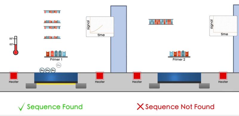 如果存在病毒,核苷酸会在核酸逐步构建的过程中被合并并释放氢离子,氢离子作为电信号被检测到。如果不存在病毒,就不会释放氢离子,也就没有可被检测到的电信号。