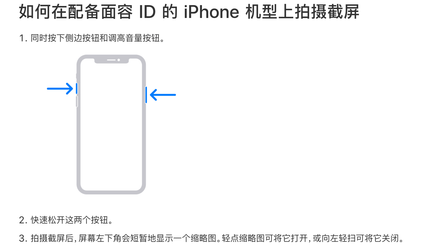 iPhone截图方式真正的大变化是从iPhone X开始的,全面屏设计砍掉了指纹识别,一并砍掉了Home键。iPhone上的实体键也就只剩下两个音量键和电源键,截图按键组合的选择就很少了。全面屏iPhone的截图方式调整为了音量上键+电源键。这个时候,电源键承担的功能变得极为繁杂,除了原来的开机功能外,还接管了原本Home键的呼出Siri操作。