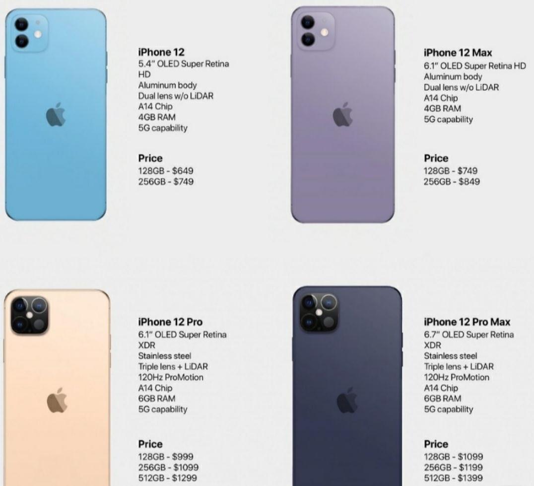 最近网上同时也曝光了一组iphone12的配置信息图,共分为四个机型。