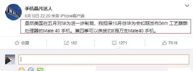 6月10日消息,微博博主透露:虽然美国对华为进一步制裁,但其仍担保华为会在10月份发布搭载5nm工艺麒麟芯片的Mate 40系列旗舰。与此同时,@手机晶片达人还爆料,华为在2020年第四季度可以向市场供应的Mate 40系列旗舰的数量大概在800万台左右。