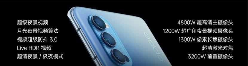 OPPO Reno4 则后置搭载 4800 万 + 800 万 + 200 万超清激光对焦三摄,前置双摄为 3200 万 + 200 万组合,同样具备超级夜景视频、视频超级防抖 3.0 等视频拍摄功能。