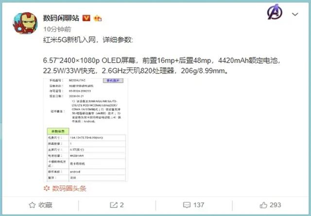 华为mate20系列是第一款使用“浴霸”设计的手机厂商,根据工信部入网许可,小米即将要发布一款最便宜的5G手机,千元出头,在摄像头排列上,也采用了和华为mate20类似的“浴霸”设计。不仅如此,荣耀把本来应该叫10X的手机升级为荣耀X10,而小米要发布的这款手机,就叫红米10X。这不算什么,更加惊讶的是:红米这款手机也搭载820处理器!