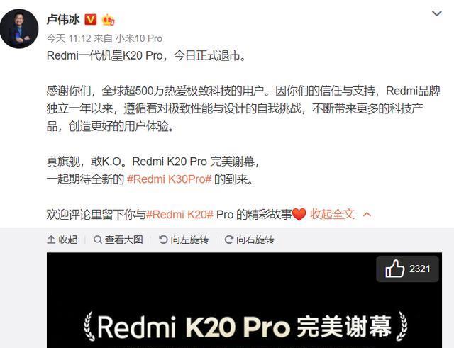 就在刚刚,卢伟冰正式官宣了Redmi今天要带来的喜事,卢伟冰表示,Redmi旗下首款高端旗舰——RedmiK20Pro正式退市,Redmi给所有K20系列用户准备了退市谢幕礼。加上昨天已经宣布的喜事,RedmiK305G大存储版本新机到来,然后今天还有RedmiK20Pro退市谢幕礼可以领,这足以让广大米粉看了之后开心至极。