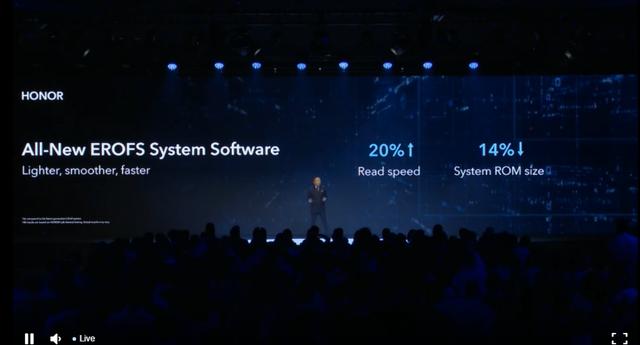 硬件配置方面比较常规,麒麟980处理器+UFS2.1+8G内存,亮点是采用了全新的EROFS文件管理系统,可以提高闪存的性能(大家可以理解为和中兴天机10pro的F2FS文件管理系统类似),但是和一加7pro的UFS3.0还是差距不小的。电池方面,依然是我们常见的4000毫安时电池(荣耀20是3750毫安时),充电依然是22.5W快充。