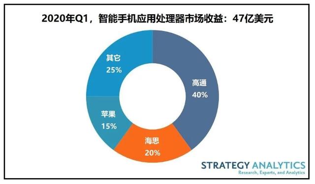 在这份报告统计值中我们可以看到,2020年的第一季度的智能手机应用处理器市场收益情况总体上为47亿美元,其中高通占比40%,华为海思占比20%,苹果占比15%,而第四名则为其他品牌,占比25%。