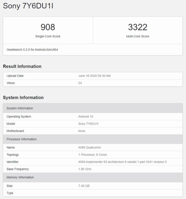 而Geekbench 上的这款神秘的索尼新机型的代号显示为Sony 7Y6DU1L,从曝光的跑分数据中也是可以看到这款机型单核心跑分为908分么人多核心跑分为3322分,这个水平可以说是相当不错了。