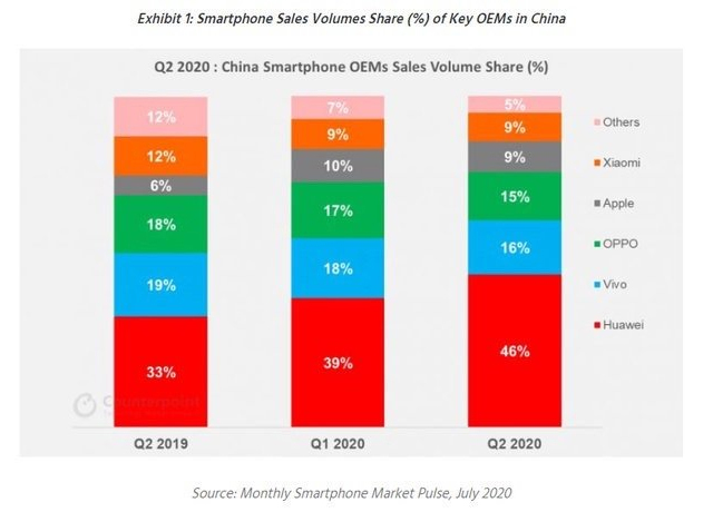 根据另一家调研机构Counterpoint的数据显示,2020上半年国内智能手机市场中,华为的份额已经达到46%,远超vivo、OPPO、苹果和小米。这一方面与华为手机的5G网络性能表现出色有关,另一方面也是因为华为在海外市场受到了不公正的待遇,反而激起了国内消费者的购买欲望。
