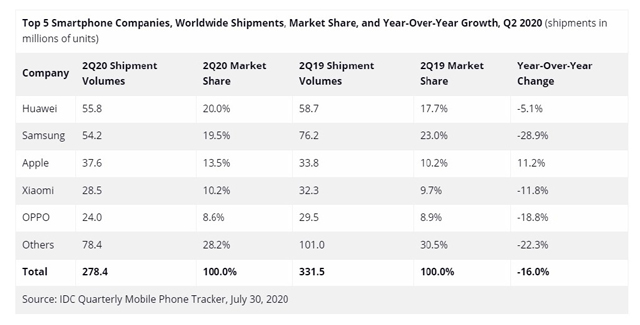 随着苹果财报的公布,行业调研机构IDC也公布了2020年第二季度手机市场出货量排名,这次上榜的厂商仍然是大家熟悉的五个品牌,但是排名却出现了一个重大的变化:华为终于超越三星排在了第一位。