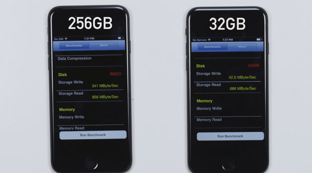 因为现在智能手机用的都是闪存芯片作为存储空间,而一个大的闪存芯片往往是2个甚至4个小的闪存芯片合并而成的。所以手机的空间一般都是64GB、128GB、256GB这种翻倍的规格。一个128GB闪存芯片就有可能是2个64GB闪存芯片合并的,一个256GB闪存芯片就有可能是2个128GB或者4个64GB合并起来的。尤其是一些老手机内存容量大的用MLC闪存,内存小的用次一等的TLC闪存,二者的速度差距还是很大的。如下图所示256GB的iPhone 6写入速度是32GB iPhone 6的8倍,差距还是比较大的。不过这种内存混用的现象,在最近几年的手机中已经比较少见了。