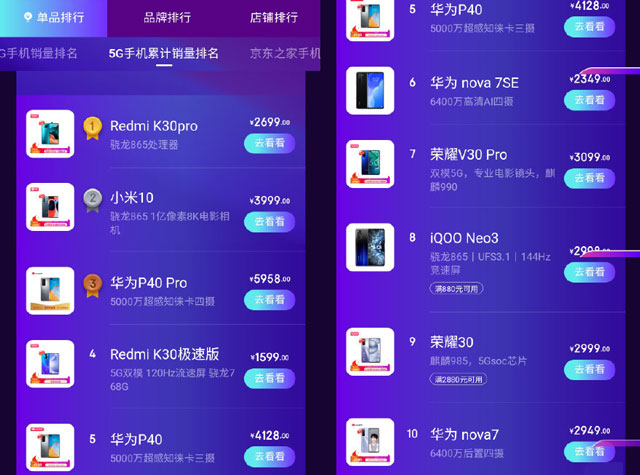 总的来说,目前5G手机还处在普及阶段,用户对价格较为敏感。同时5G的功能优势还没有体现出来,导致用户在购买高端5G手机时存在疑虑。相比之下,小米10和Redmi K30 Pro除了5G功能之外,手机的外观设计和综合体验都不差,再加上价格上的优势,能够力压华为取得京东平台618累计5G手机销量的前两名,也在情理之中。这也表明今年小米在高端手机领域的尝试是非常成功的。