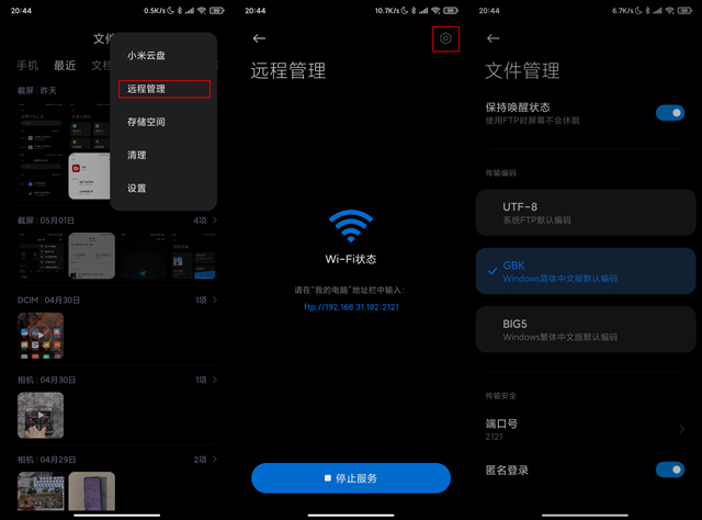 小米手机可以在系统自带的APP中,找到并打开“文件管理”,点击右上角的三个小圆点,在设置菜单中选择“远程管理”,然后在远程管理界面中点击右上角的设置图标,设置好用户名和密码。如果是在家庭使用的话,选择匿名登陆也可以。