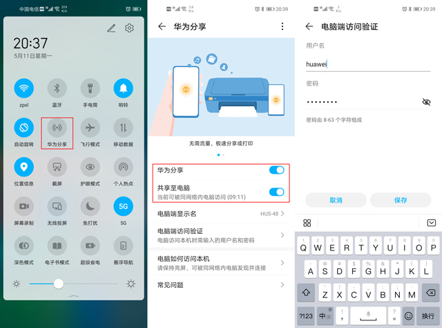 华为手机可以下拉通知栏,在控制菜单中找到“华为分享”或者“HUAWEI SHARE”这个图标,并且长按。接着在弹出的界面中打开“华为分享”,然后再打开“共享至电脑”。这个时候如果你的手机和电脑在同一个WiFi网络中,打开电脑的“网络邻居”,就可以找到一个以手机型号命名的共享设备。然后在手机的“电脑端访问验证”中,设置好访问的用户和密码,并且保存。