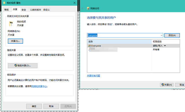 首先,需要在Windows系统中建立一个文件夹,然后在“右键-属性”中选择“共享”,在弹出的“网络访问”菜单中,选择“Everyone”,如下图所示: