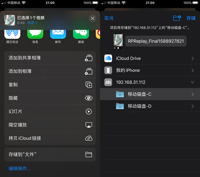 最后在手机相册中找到需要传输的视频,然后点击“发送”图标,下拉后选择“存储到文件”,然后找到电脑的共享文件夹,再点击“存储”,视频就会传输到电脑的共享文件夹当中了。