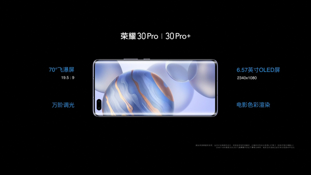首先性能最强的荣耀30 Pro+主要以拍照为卖点。它的正面是一块6.57英寸的OLED曲面屏,屏幕两侧的弧度达到了70°,因此官方称其为“飞瀑屏”。这块屏幕的分辨率为2340×1080,19.5:9的比例,支持90Hz刷新率。由于使用了曲面屏的缘故,它的机身边缘最窄处1.3mm,最厚处为8.38mm,重量只有190g,在5G旗舰手机中算是比较轻薄的一款。