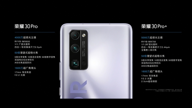 对比来看,荣耀30 Pro+和30 Pro的主要区别在于主摄像头,IMX700的暗光拍照能力要强于IMX600,像素也更高一些。不过两者均配备了潜望式摄像头,所以远摄功能的差距并不大。不过荣耀30 Pro只支持40W有线快充,不支持27W无线快充。