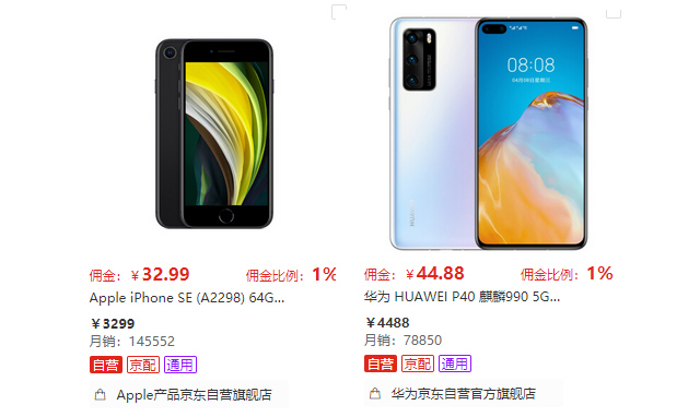 通过京东联盟后台也可以看到,新款iPhone SE预售一周以来,销量已经超过14万台,热度非常惊人。作为对比,稍早时上市的华为P40的京东月销量为7.8万台,差不多只有新款iPhone SE的一半儿。同样是小屏旗舰,老款产品的复刻版本和新款手机的差距如此之大,也让不少业内人士感到意外。