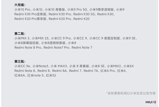 根据官方计划,MIUI12开发版会在5月8日公测,MIUI12稳定版将在六月份开始推送,包括小米10、Redmi K30 Pro、小米9、小米8、小米CC9、Redmi K20、Remi Note 8等热门机型,具体见下图: