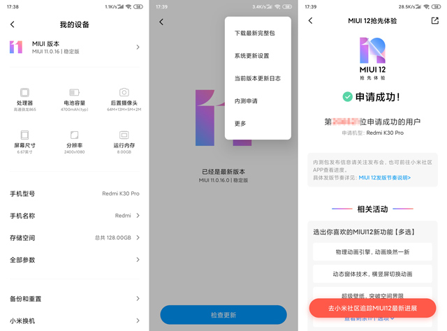除了上述几个主要功能之外,还增加了深色模式2.0、万象息屏+、待办清单、极简模式等新特性。感兴趣的小米手机用户,可以前往手机里的「我的设备」-「MIUI版本」,点击右上角的三个小圆点,选择「内测申请」,根据提示操作申请内测资格即可。申请过程中需要填写一份关于MIUI的知识问卷,得分超过80分的网友获得内测资格的机率更高。4月27日18点开始会陆续向已获得MIUI12开发版内测资格用户推送OTA升级,正在使用MIUI11稳定版的用户获取内测资格后,也可以前往MIUI论坛下载内测卡刷包升级。升级之前记得一定要备份好手机中的重要数据!