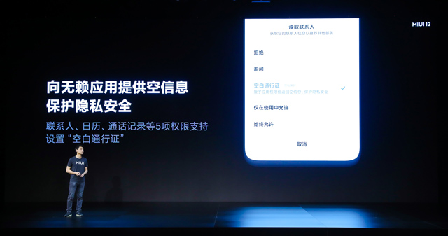 现在手机APP要求的权限越来越多,甚至有部分APP不给权限就不让用。针对这种情况,MIUI12可以生成一张特殊的“空白通行证”,当APP要求获取联系人、日历、通话记录等5项关键权限时,可以使用“空白通行证”来避免APP拿到真实的隐私数据。另外MIUI12还可以向未登录的APP提供虚拟的身份ID,使用虚拟的身份来代替用户的真实身份识别,防止应用对用户的行为喜好记录进行追踪,保护用户的个人隐私。