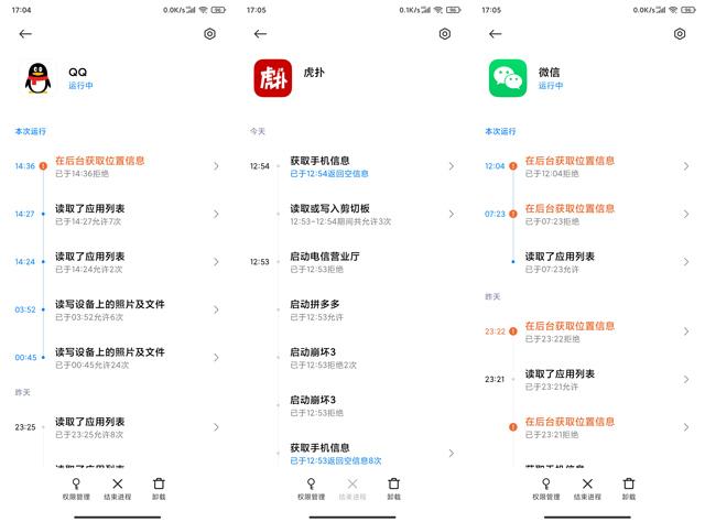 针对这种情况,MIUI12则新增了一个“隐私保护”功能,在这里可以看到手机里所有应用软件的权限使用统计。比如我手机里的QQ软件在14点24分到14点27分的短短三分钟时间里,就读取了9次应用列表,并在后台尝试获取位置信息。