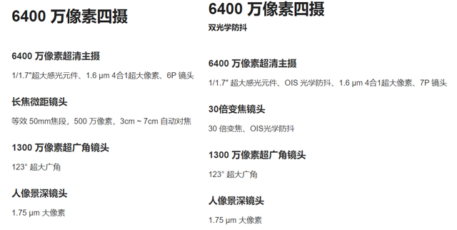 首先来说说Redmi K30 Pro标准版和超级变焦版的区别,其实从名称上就可以看出,两者的区别主要在拍照上。两个版本共同的地方就是主摄都是6400万像素的索尼IMX686,并且支持OIS光学防抖,还有一枚1300万像素的123°超广角镜头,和一枚200万像素的景深镜头。也就是说,两个版本的三颗摄像头都是一样的。