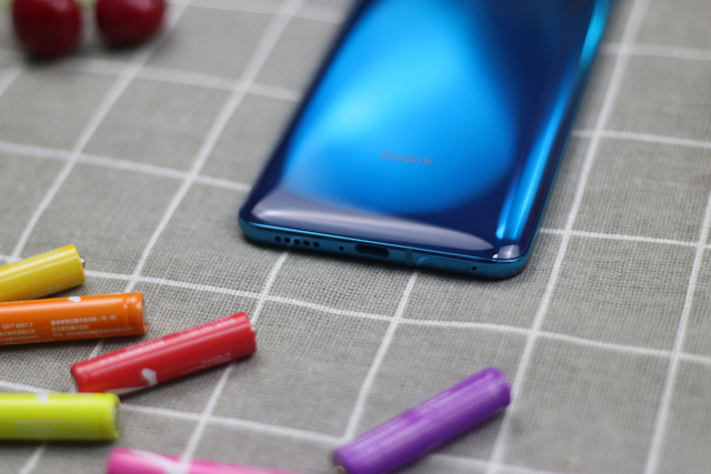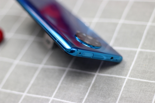 再来看背面,Redmi K30 Pro有AG玻璃和亮面两种机身配色,蓝色版使用的是AG玻璃,这种玻璃材质的优点是不容易沾指纹,同时也保证了机身的质感。值得一提的是,这款手机的正反两面都是康宁大猩猩第五代玻璃。