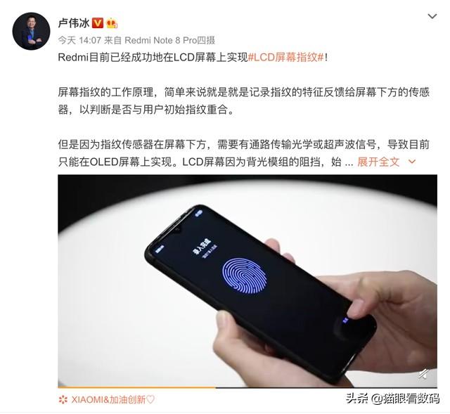 那么有没有办法在LCD屏幕上实现屏下指纹识别呢?小米的Redmi团队近日传来好消息,根据小米副总裁、Redmi品牌卢伟冰的亲自爆料:Redmi研发团队成功的在一台Redmi Note8 Pro样机上实现了LCD屏下指纹识别。