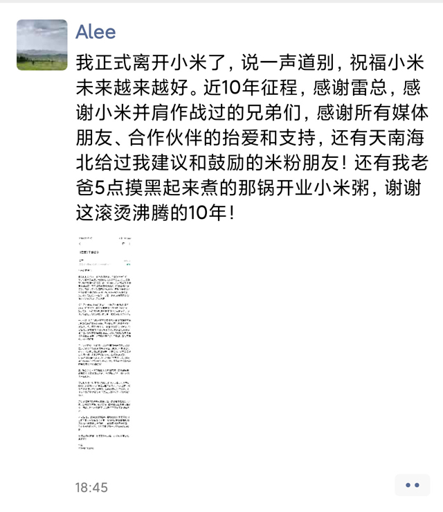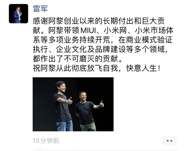 黎万强宣布离职之后,也在自己的朋友圈里写道:“我正式离开小米了,说一声道别,祝福小米未来越来越好。近10年征程,感谢雷总,感谢小米并肩作战过的兄弟们,感谢所有媒体朋友、合作伙伴的抬爱和支持,还有天南地北给过我建议和鼓励的米粉朋友!还有我老爸5点摸黑起来煮的那锅开业小米粥,谢谢这滚烫沸腾的10年!”