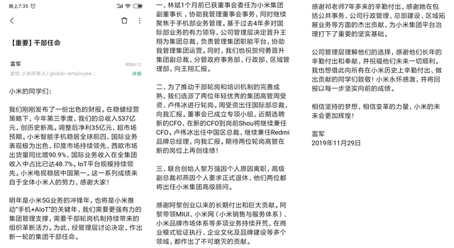 小米集团高级副总裁、原CFO周受资接替王翔的工作,升任国际部总裁,并在新人CFO到任之间继续兼任CFO职务。小米集团副总裁,Redmi品牌负责人卢伟冰将出任小米集团中国区总裁,并继续担任Redmi品牌总经理。