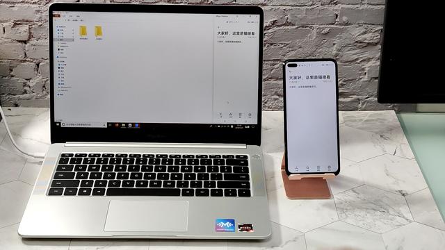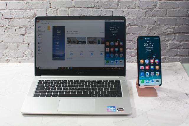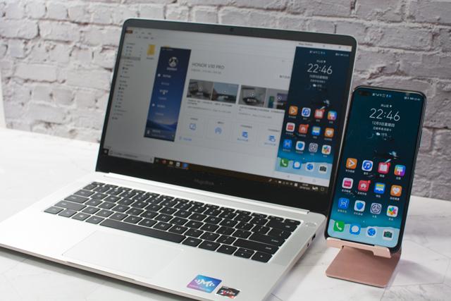 以刚刚上市的荣耀V30 Pro和荣耀Magicbook 2019为例,二者通过“多屏协同”功能建立连接之后,笔记本的屏幕上即可显示手机的屏幕内容。与此同时,使用笔记本的鼠标和键盘滑动笔记本中的手机屏幕,即可实现对手机的控制。