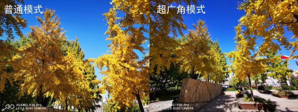 华为P30 Pro的2000万超广角镜头提供16mm等效焦距,视觉冲击自带加成。上图可见,华为P30 Pro超广角模式下四周都有更多景物容纳其中,画面线条呈现放射状,“近大远小”的效果成倍展现,画面层次感由此凸显。无边的枫叶林、悠长的银杏小道,用超广角镜头拍下来,都足够震撼。