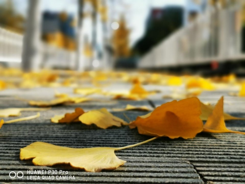 最后,拍一些不寻常角度的画面,让整组图更有个性。比如上图,将手机放在地面,拍摄一地落叶,展现另一个角度的世界。配合华为P30 Pro大光圈模式,选择适当光圈大小,将背景进行更深层次虚化,画面虽仅聚焦几片落叶,却让人充分感受到秋天气息,虚化的背景更有梦幻感。