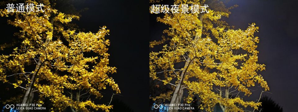 华为P30 Pro还支持6秒手持超级夜景模式。在此模式中,开启6秒长曝光,配合OIS光学防抖+AIS智能防抖,为画面展现更精密的细节。对比可见,阴影中的树叶和后方树的轮廓更清晰地显现出来,树叶也更显茂盛。从此拍摄无惧黑暗,阴影、高光都能搞定。