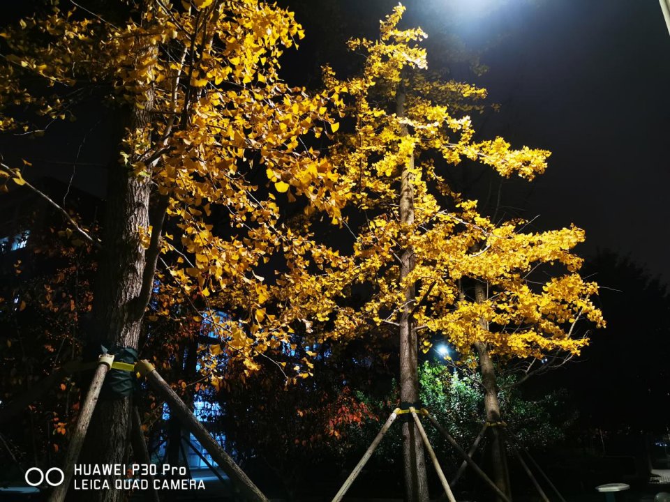 从华为P30 Pro样张中可以看到,黑夜中的银杏叶在路灯下发出金黄色彩。图片整体保证亮度的同时,无明显噪点,赋予了画面极高纯净度;上方和后方的路灯虽然很明亮,但依然可以从光晕中看到灯架轮廓,可见华为P30 Pro高光压制方面做得不错;色彩还原也很准确,将银杏叶色泽充分展现。