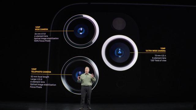 iPhone 11 Pro和iPhone 11 Pro Max均采用了后置三摄的设计,三颗摄像头分别为超广角、广角和长焦镜头,支持0.5到2倍的光学变焦。三颗摄像头均为1200万像素,焦距分别为13mm、26mm、52mm,光圈分别为f/2.4、f/1.8、f/2.0,支持夜景模式。三颗摄像头都可以拍摄4K60FPS的视频,可以在变焦过程中平滑过度。在专业模式中,三颗摄像头同时取景,可以帮助摄影师获得最佳的取景角度。在视频拍摄完毕之后,还支持在手机中直接编辑视频。