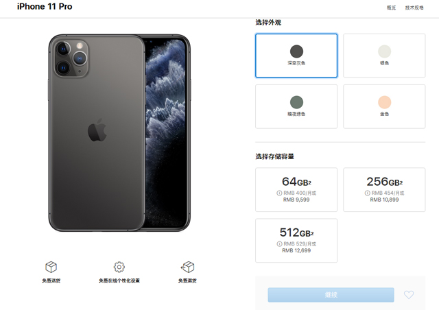 iPhone 11 Pro 64GB售8699元,256GB售9999元,512GB售11799元;