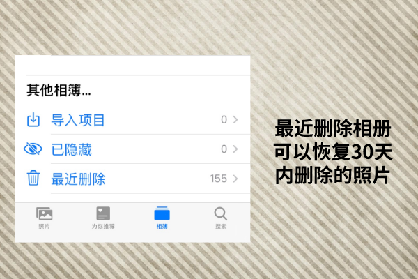 当然就是手机自带的“最近删除”相册啦,无论是删除了手机里面的照片或者是视频,我们都可以去我们的“最近删除”相册里面找一找,你最近删除的照片或者视频都在里面,点击你所想恢复的那一张就能将其恢复到原来相册的位置。