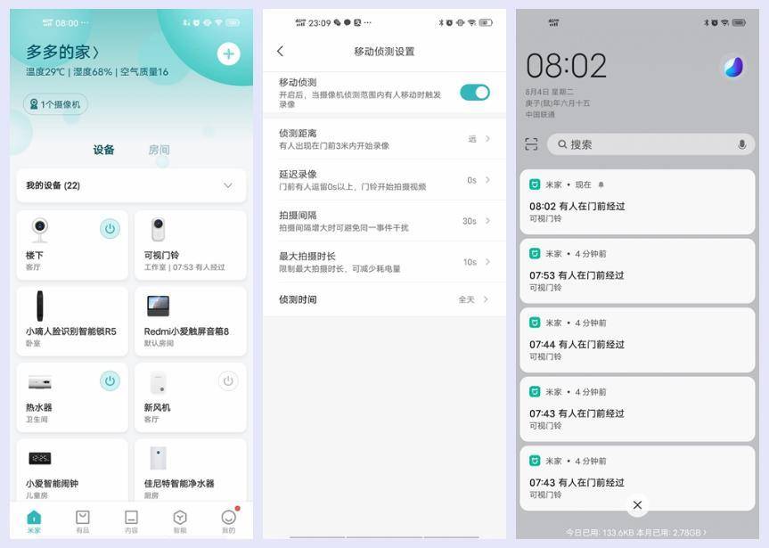 在米家APP绑定叮零智能可视门铃C5,手机便可以接收到来自门铃的推送报警,它的移动侦测很好用,门前3米内的移动对象都能触发抓拍功能,如果门前行人较多,可在设置中调节侦测距离和延迟录像,这样能够筛选掉门前行人,只对门前逗留人员录像,这样做既能省电,也能达到精准的录像目的。