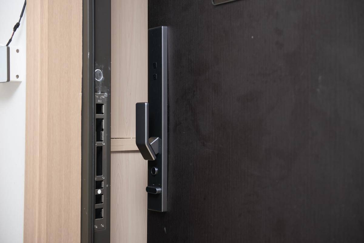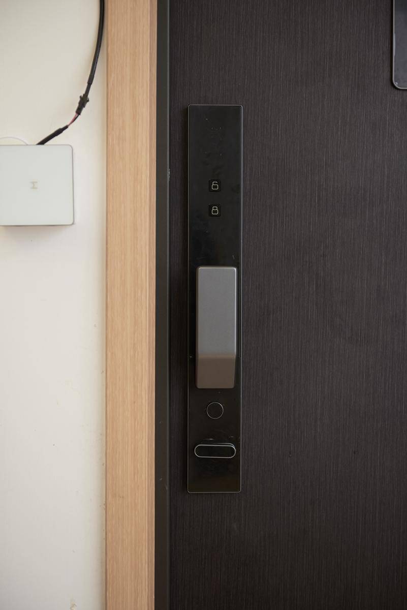 这款门具有创米科技28项产品专利,有一少半都在这个锁具中。嵌入式面板是一大亮点,与门板几乎平齐的指纹锁面板不仅看上去更为美观,也加大了防撬难度,面板材质选用了特种钢化玻璃,而内部脆弱的意法半导体主芯片设计在锁芯后面,即使有外力破坏了面板,也无法突破全不锈钢材质的霸王锁体,此外还有贯穿式真插C级锁芯的加持,这款锁具的防爆性能要优于那些高高凸起的智能锁。