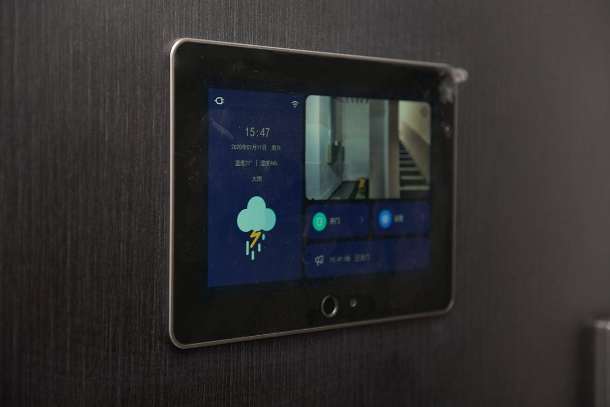 大屏的作用不止于此,除了带有人体红外感应系统的猫眼功能,屏幕上还能看见当地的室外天气信息,数据更新网络同步,贴心的功能会让你想起带上雨具或增添衣物。