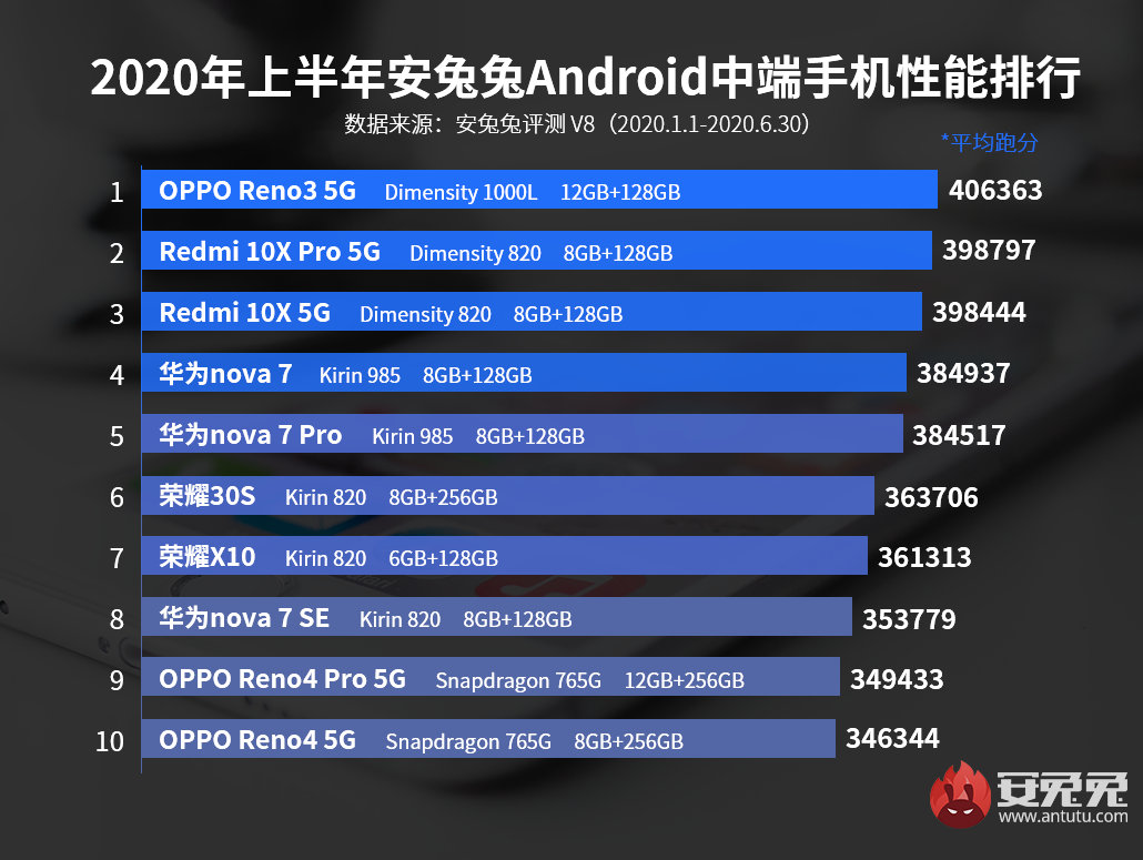 (OPPO Reno4 Pro 登上了上半年年安兔兔中端手机性能排行榜)